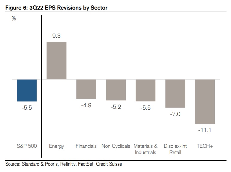 在瑞信观察的这些板块之中,能源板块(XLE.US)是唯一一个没有对标普500指数第三季度和2023年EPS预期下降呈负贡献的行业,市场普遍认为第三季度该板块EPS水平将上升9.3%。
