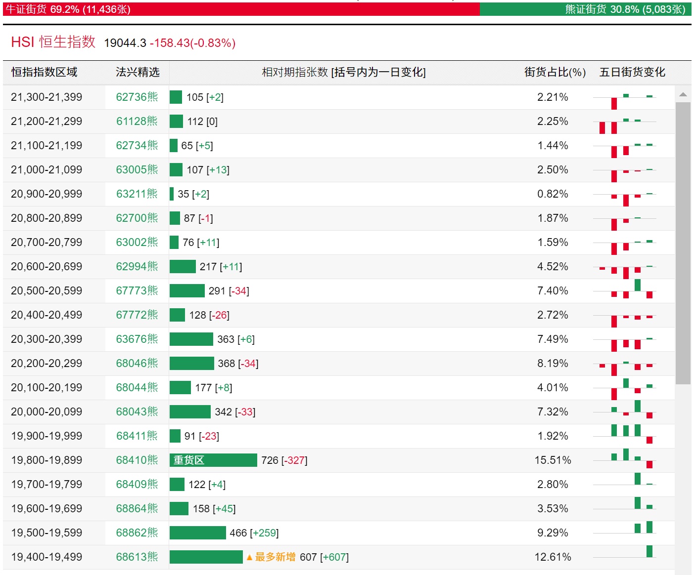 法兴恒指牛熊证街货分布图中的数据显示,熊证街货重货区在19800-19899区间,该区间最新熊证数量为726张,较上一交易日减少327张;最多新增在19400-19499区间,该区间最新熊证数量为607张,较上一交易日增加607张。