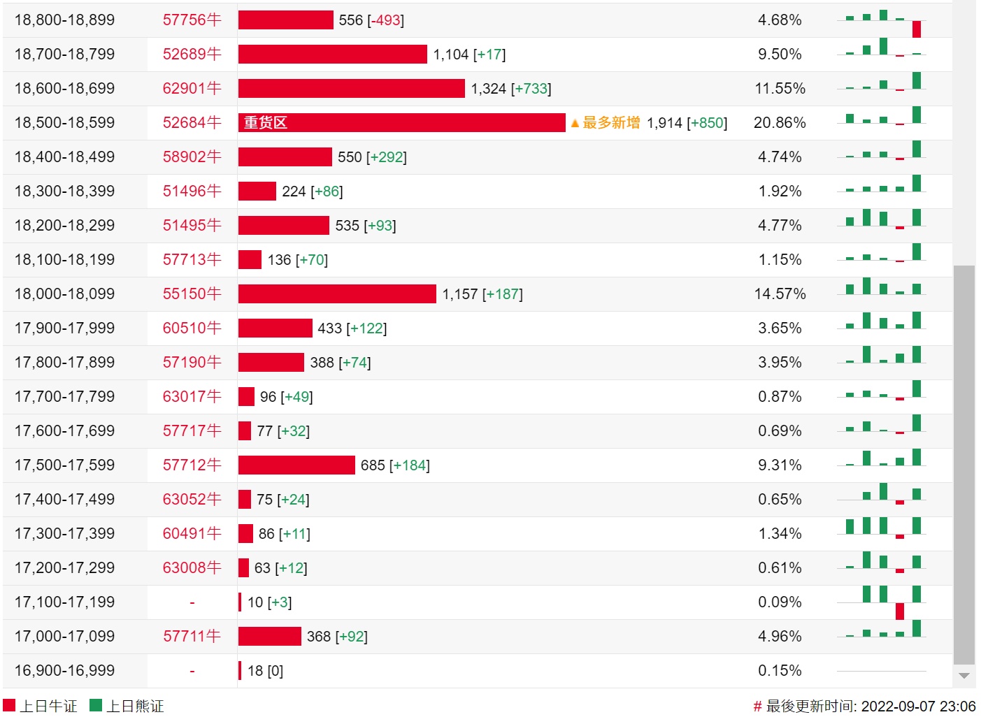牛证街货重货区和最多新增都在18500-18599区间,该区间最新牛证数量为1914张,较上一交易日增加850张。