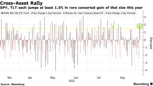 事实上,空头匆忙回补似乎是标普500指数上涨近2%的原因之一。高盛一篮子被做空最严重的股票上涨了4.4%,是标普500指数涨幅的两倍多;在固定收益债券方面,美国国债收益率停止了升至多年高位的涨势。追踪标普500指数和美国国债的两大交易所交易基金(ETF)上涨了至少1.5%,这是今年第二次两者都上涨这么多。