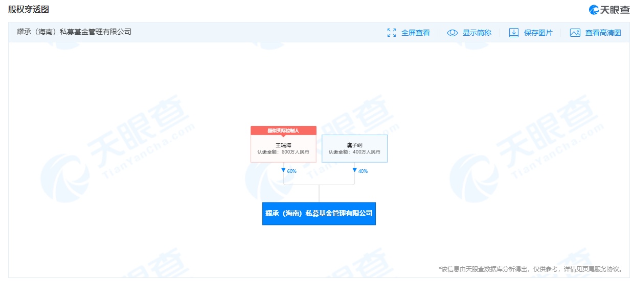 天眼查信息显示,除了王瑞海外,耀承私募还有另一位合伙人——虞子纲。从出资比例上看,王瑞海出资600万,持有60%股份,为公司第一大股东;虞子纲出资400万,持股比例为40%,为第二大股东。