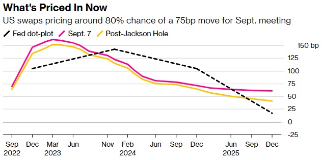 随后,CME“美联储观察”工具显示美联储9月份加息75个基点概率水平达到上次会议来新高。虽然只是短暂维持,但与美联储9月议息会议挂钩的掉期利率达到8月5日以来的最高水平,当时强劲的7月非农数据将该利率推至高位。