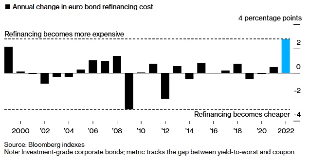 另一个压力点是资金来源及其成本,企业利用债务融资的能源变得更加困难。在欧洲央行收紧货币政策、收益率上升以及普遍的风险担忧情绪之间,再融资借贷的成本越来越高。数据显示,新债券相比于现有债券的额外利息成本为每1亿美元增加200万美元。