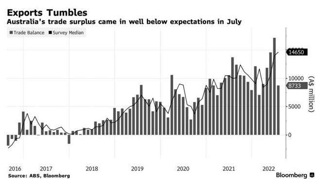 智通财经APP获悉,澳大利亚7月份贸易顺差环比缩窄近半,原因是关键的煤炭和铁矿石出口大幅下降,同时国内消费者纷纷出国度假。