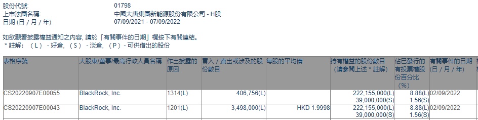 智通财经APP获悉,香港联交所最新资料显示,9月2日,贝莱德减持大唐新能源(01798)349.8万股,每股作价1.9998港元,总金额约为699.53万港元。减持后最新持股数目约为2.22亿股,最新持股比例为8.88%。