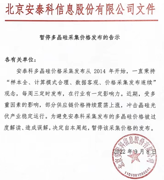 智通财经APP获悉,9月8日,中国有色金属工业协会硅业分会发布告示称,安泰科多晶硅价格采集发布从2014年开始,每周三定时发布,在行业有一定影响力。近期,受多重因素的影响,部分供应链价格持续震荡上涨,冲击晶硅光伏产业稳定运行。硅业分会称,为避免安泰科采集发布的多晶硅价格被过度解读、造成误解,决定自本周起,暂停多晶硅采集价格的发布。