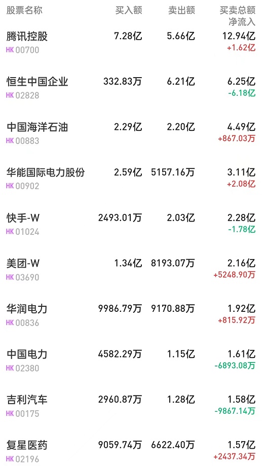 北水净买入最多的个股是腾讯(00700)、华能国际(00902)、华润电力(00836)。北水净卖出最多的个股是恒生中国企业(02828)、中国海洋石油(00883)、兖矿能源(01171)。