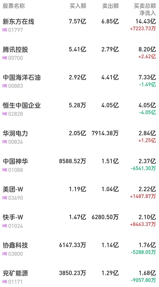 此外,美团-W(03690)获净买入6736万港元。而恒生中国企业(02828)、中国海洋石油(00883)分别遭净卖出10.23亿、1.4亿港元。
