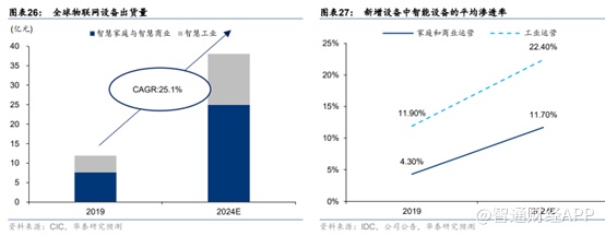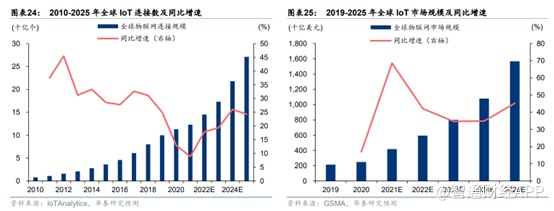 此背景下,物联网连接数稳步增长,网络效应推动物联网价值持续扩张。据IoT Analytics研究,2020年全球物联网连接数将超113亿个,首次超过非物联网连接数,2010-2020年十年间CAGR达30.3%,2021年至2025年的CAGR预计达21.8%,连接数持续快速增长。