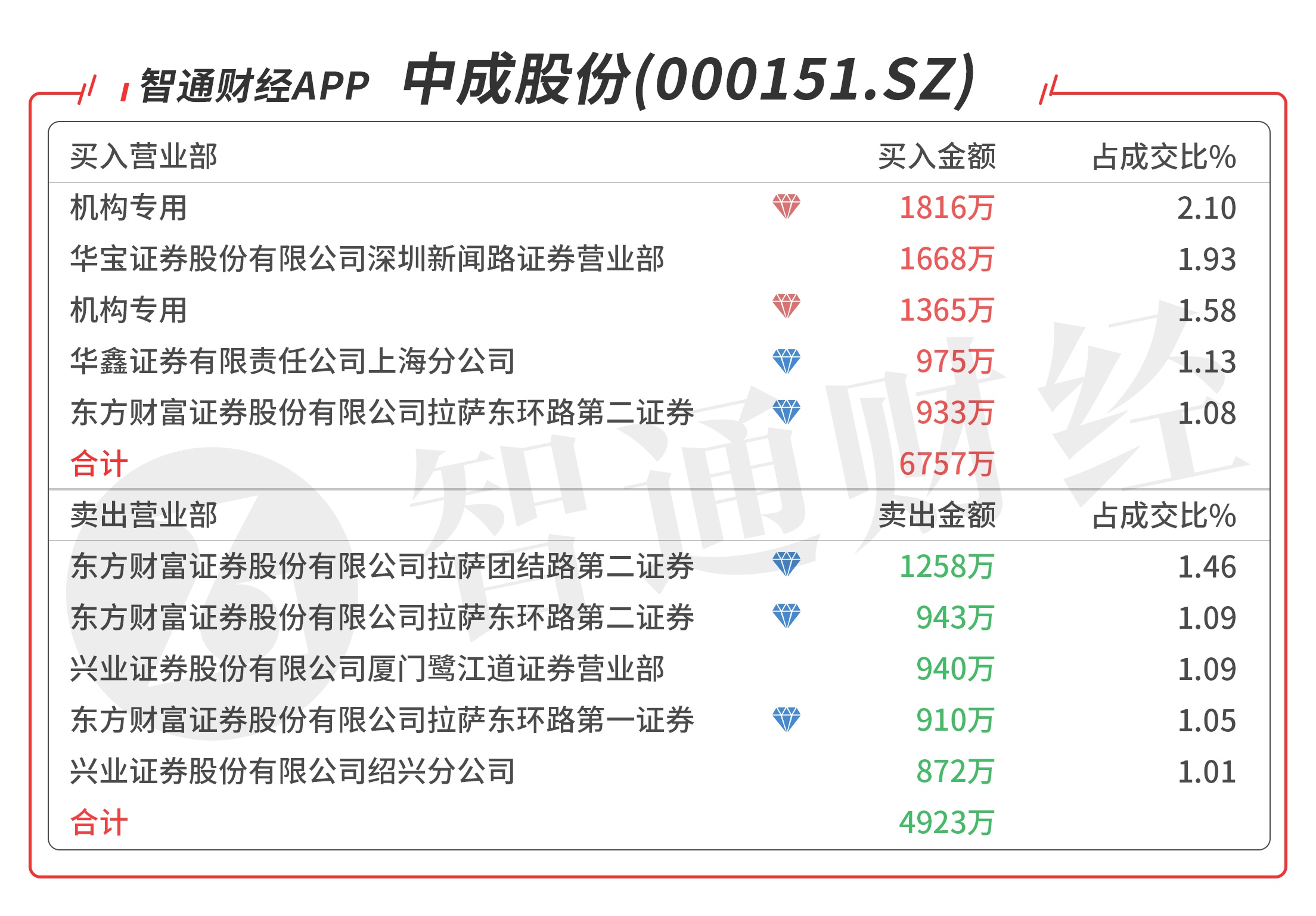 中成股份(000151.SZ):多主力现身龙虎榜,机构席位买入2788万元,买四是知名游资的席位买入967万元,当日净买入2838万元,该股今日放量涨停,预计有溢价。