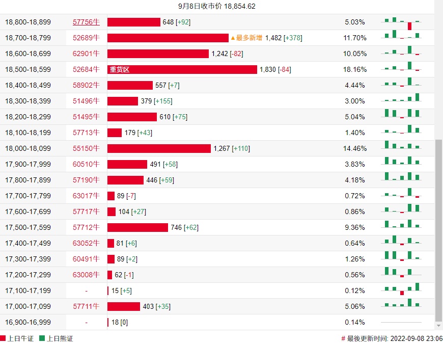 牛证街货重货区在18500-18599区间,该区间最新牛证数量为1830张,较上一交易日减少84张;最多新增在18700-18799区间,该区间最新牛证数量为1482张,较上一交易日增加378张。