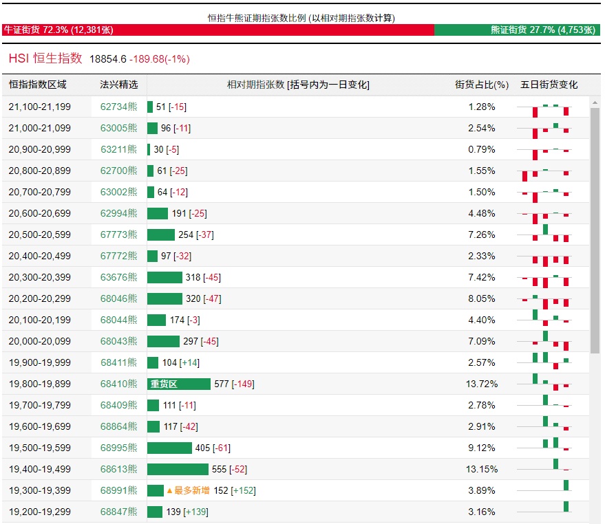 法兴恒指牛熊证街货分布图中的数据显示,熊证街货重货区在19800-19899区间,该区间最新熊证数量为577张,较上一交易日减少149张;最多新增在19300-19399区间,该区间最新熊证数量为152张,较上一交易日增加152张。