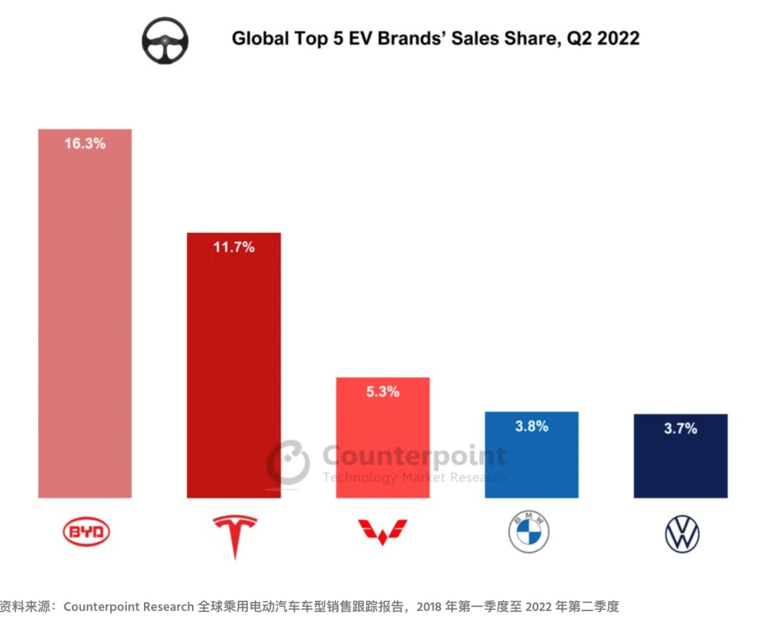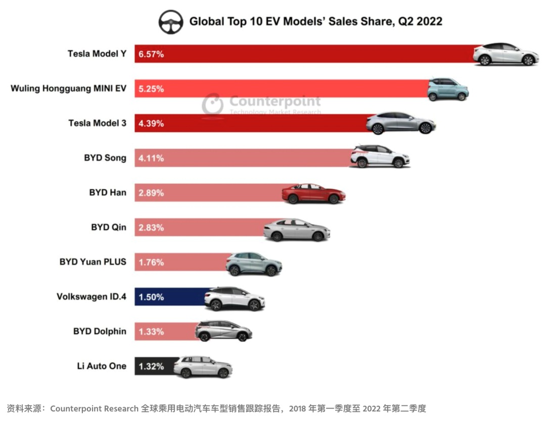 2022年Q2,排名前10位的电动汽车车型占全球电动汽车销量的30%以上。特斯拉的Model Y仍然是最畅销的电动汽车车型。五菱宏光的Mini