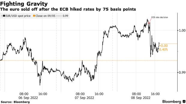 智通财经APP获悉,周四,在欧洲央行如期加息75个基点后,欧元反而遭到大幅抛售。欧元兑美元汇率跌破平价,跌幅一度达到0.8%。这凸显出,与俄乌冲突造成的经济破坏规模相比,欧洲央行的货币政策目前对交易员来说无足轻重。