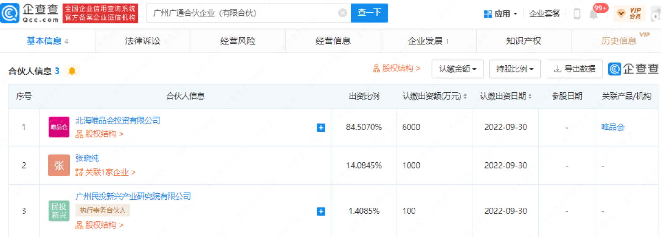 智通财经APP获悉,企查查APP显示,近日,广州广通合伙企业(有限合伙)成立,执行事务合伙人为广州民投新兴产业研究院有限公司。该企业由北海唯品会投资有限公司、张晓纯、广州民投新兴产业研究院有限公司共同持股。