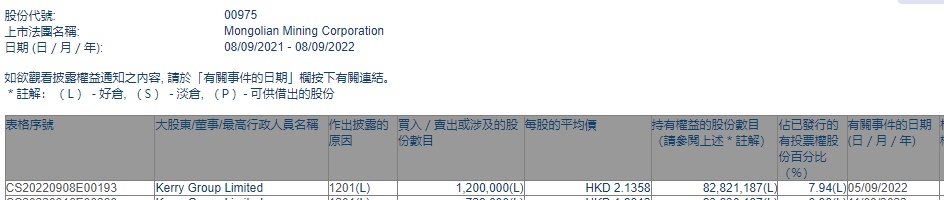 智通财经APP获悉,香港联交所最新资料显示,9月5日,Kerry Group Limited减持蒙古焦煤(00975)120万股,每股作价2.1358港元,总金额约为256.30万港元。减持后最新持股数目约为8282.12万股,最新持股比例为7.94%。