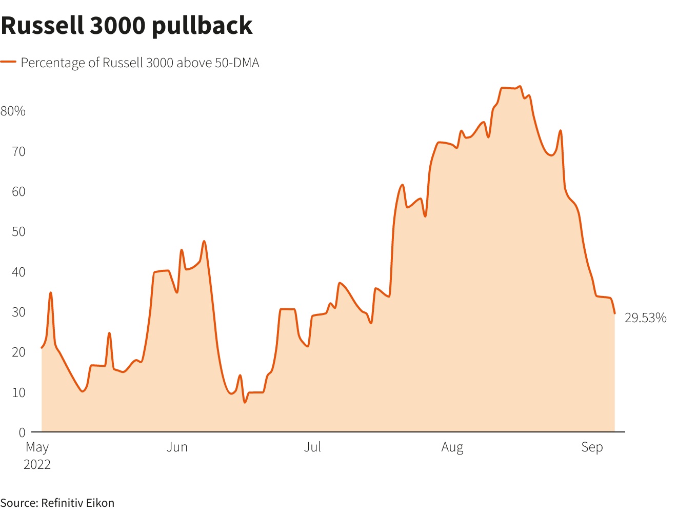 最近,“市场广度”开始发出令人不安的信号。在罗素3000指数50日移动均线上方交易的股票比例已从8月中旬的约86%降至约30%。