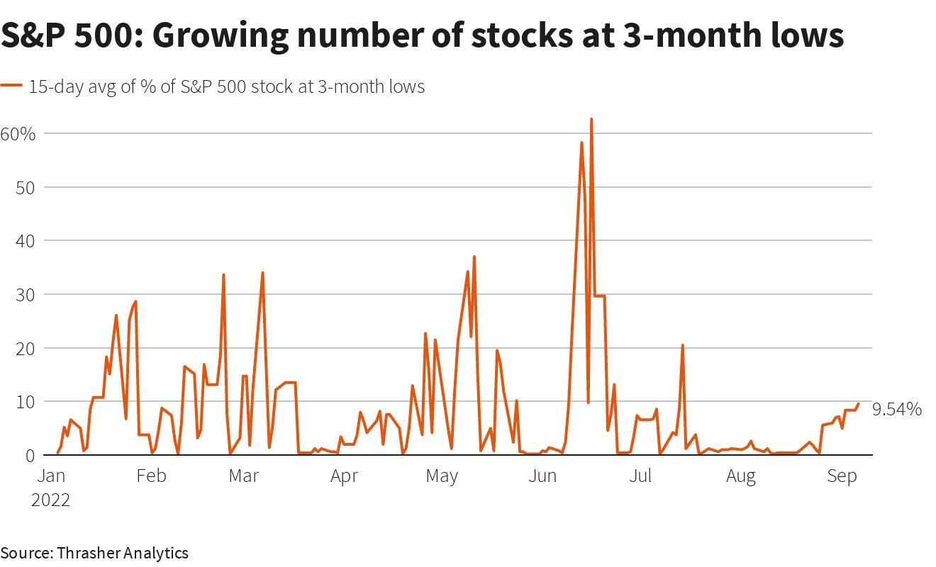 与此同时,Thrasher Analytics的统计数据显示,标普500指数成份股触及三个月新低百分比的15日移动平均统计指标(衡量市场广度的另一个指标)已从8月中旬略高于零攀升至约10%。在6月份的阶段性低点时,该比例约为60%。