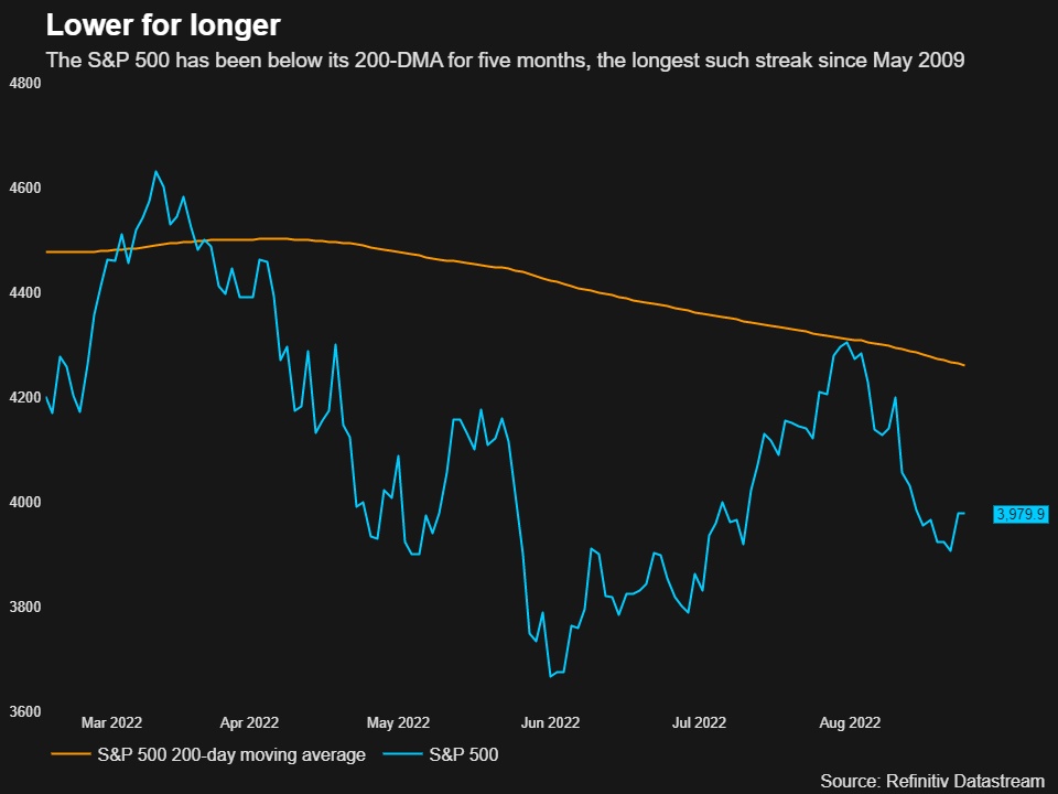 此外,如上图所示,标普500指数已连续五个月徘徊在200日移动均线下方区域,为2009年5月以来持续时间最长的一次。