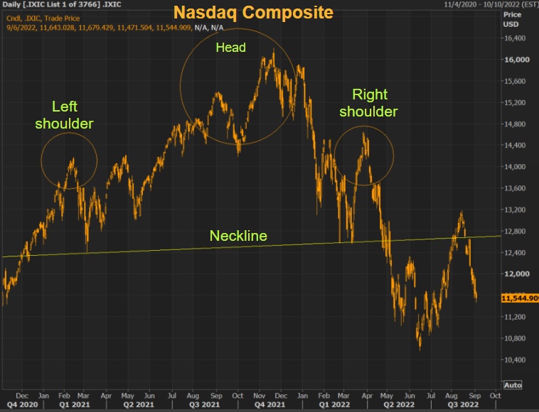 总体来看,科技股最近几周受到的打击尤其严重,以科技股为主的纳斯达克综合指数自8月中旬以来下跌约10%。一些技术面观察人士认为,该指数未来还会遇到更多挑战。该指数最近形成了一个由多转空的趋势逆转,被技术分析界称为“头肩顶”(head and shoulders top)。