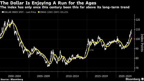 要了解美元上升趋势的强度,可查看美元指数相对其自身200天移动平均线的表现。在此之前,美元在本世纪只出现过一次这么强劲的走势。那是在2015年,当时外汇市场受到自2014年开始的油价暴跌的影响而进行了调整。