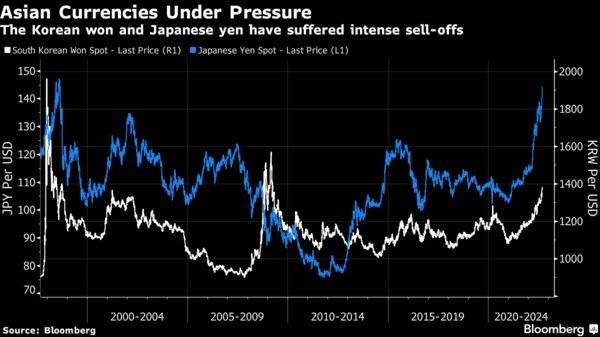 美元的力量无处不在。相对于亚洲两大出口国日本和韩国的货币,美元现在几乎已经达到了1998年亚洲金融危机以来的最高水平。韩元仍远强于1997年灾难性贬值期间的表现,但仍处于2008年全球金融危机以来的最低水平。