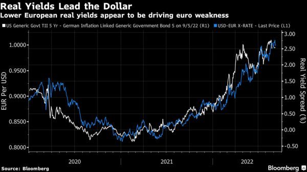 欧元也在不断贬值,其兑美元的汇率近二十年来首次跌破平价。欧洲央行周四决定加息75个基点。美国和欧元区实际收益率的差异似乎推动了美元上涨。对美国有利的差距越来越大与美元走强之间的相关性是显而易见的: