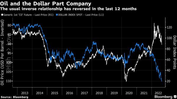但就欧洲的情况而言,将其归咎于不同央行之间的相互作用可能会产生误导。相反,与以往一样,驱动力是俄乌战争以及它对欧洲和美国能源价格造成的不同影响。这次能源冲击的表现与以往非常不同,它对欧洲的影响远比对美国的影响严重。通常情况下,美元与油价成反比关系,因为所有石油交易都以美元计价。2014年欧佩克协议破裂后出现的石油崩盘与美元走强直接对应。而这一次,即使能源价格上涨,美元也在走强。过去12个月中它们之间关系的逆转极其令人震惊。
