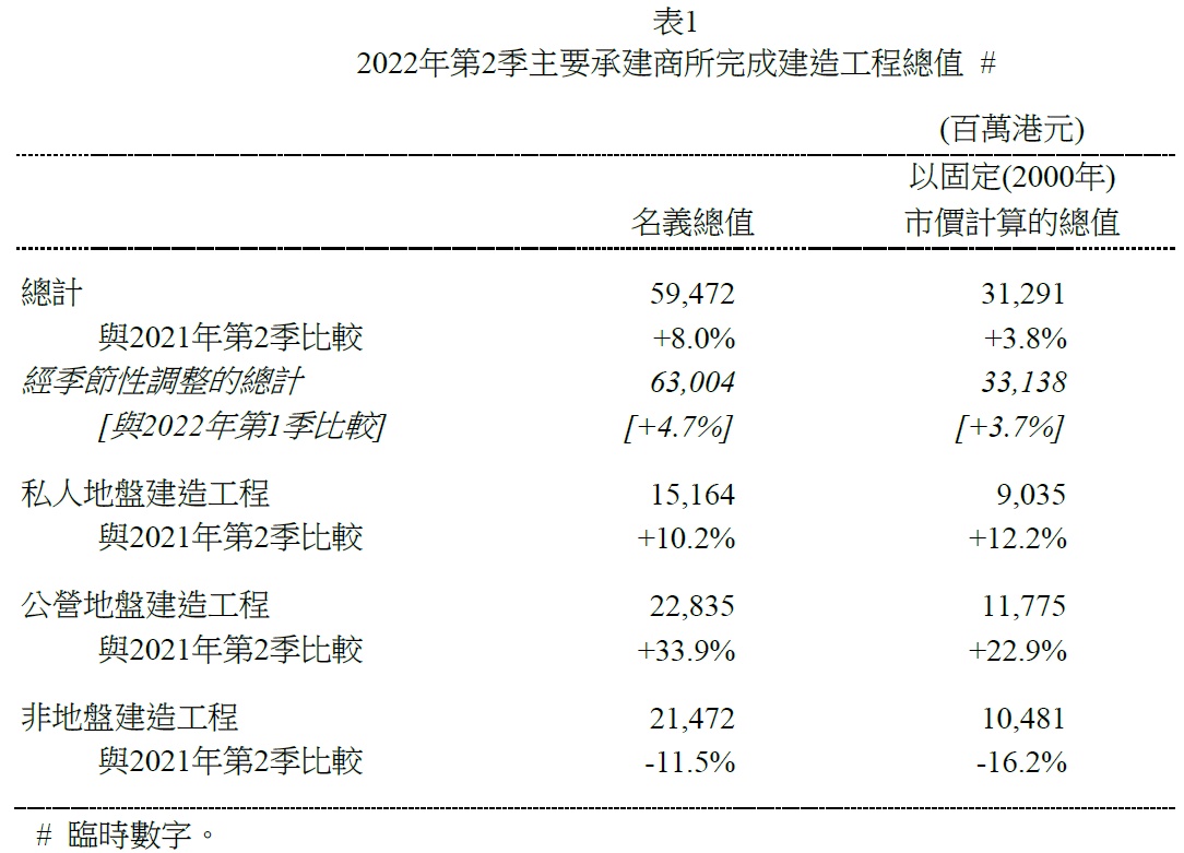 以经季节性调整的数字按季比较,主要承建商于二零二二年第二季完成的建造工程名义总值较二零二二年第一季上升4.7%。以实质计算,升幅为3.7%。