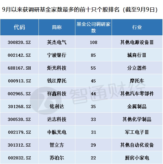 Wind数据显示,9月以来,共有209家基金公司调研了172家上市公司,其中,共有108家基金公司在9天内调研了英杰电力(300820.SZ),此外还有13只个股获得了超20家以上的基金公司的扎堆调研。宁波银行(002142.SZ)更是成为74家基金公司的关注度最高的个股。