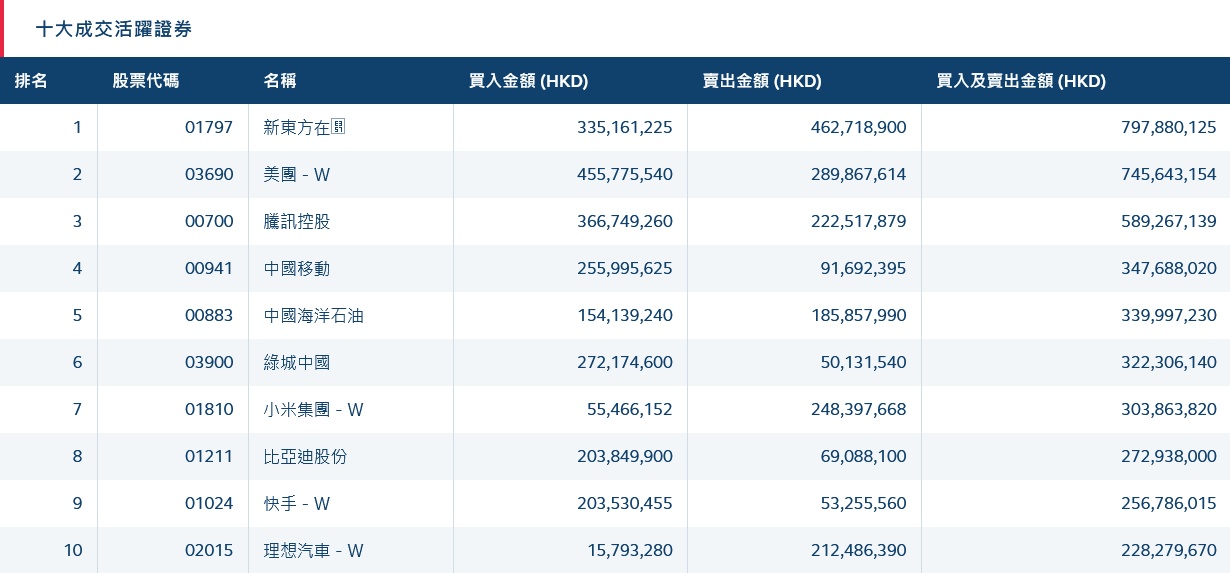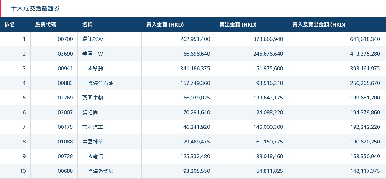 港股通(沪)十大活跃成交股