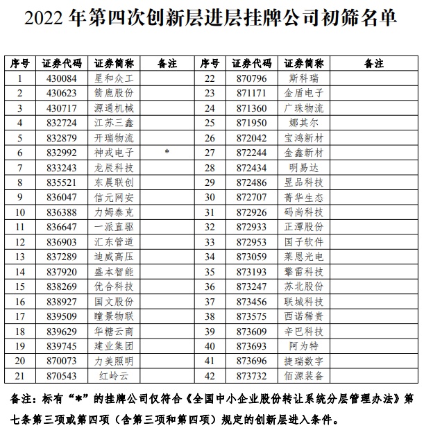 智通财经APP获悉,9月9日,全国股转公司发布2022年第四批拟调入创新层的挂牌公司(以下简称拟进层公司)初筛名单,共计42家公司拟调入创新层。其中,星和众工、箭鹿股份、源通机械、江苏三鑫等公司均在本次初筛名单中。本批次调层结束后,新三板2022年进层实施工作将全部完成,创新层公司数量将首次超过1700家,较北交所设立前增加三成,层级规模将再创历史新高。