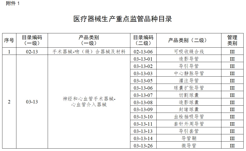 (二)结合实际确定重点监管品种目录。国家药品监督管理局根据医疗器械产品风险程度制定并动态调整医疗器械生产重点监管品种目录(见附件1);省、自治区、直辖市药品监督管理部门应当综合分析本行政区域同类产品注册数量、市场占有率、生产质量管理总体水平和风险会商情况等因素,对国家药品监督管理局制定的目录进行补充,确定本行政区域医疗器械生产重点监管品种目录并进行动态调整。