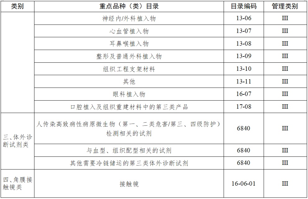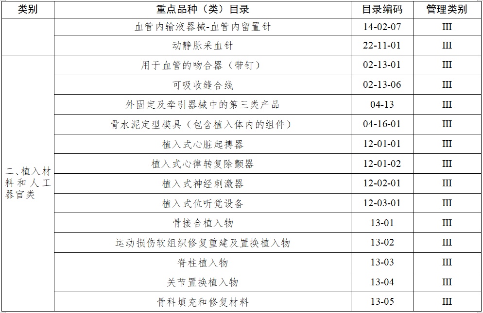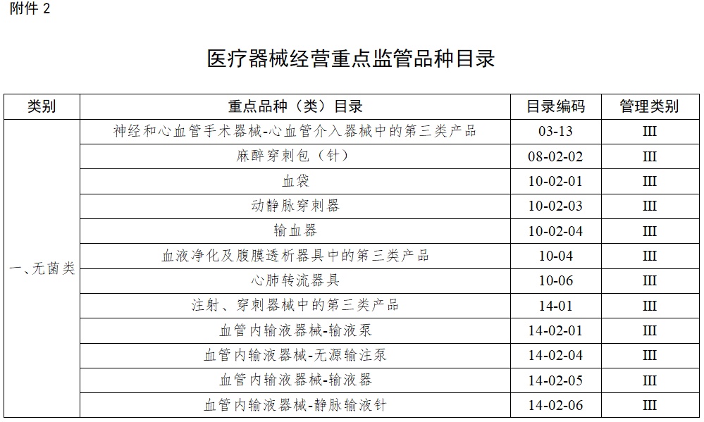 (七)结合实际确定重点监管品种目录。国家药品监督管理局根据医疗器械产品和产品经营风险程度,制定并动态调整医疗器械经营重点监管品种目录(见附件2);设区的市级负责药品监督管理的部门应当综合分析产品监督抽验、不良事件监测、产品召回、质量投诉、风险会商情况等因素,对国家药品监督管理局制定的目录进行补充,确定本行政区域医疗器械经营重点监管品种目录并进行动态调整。