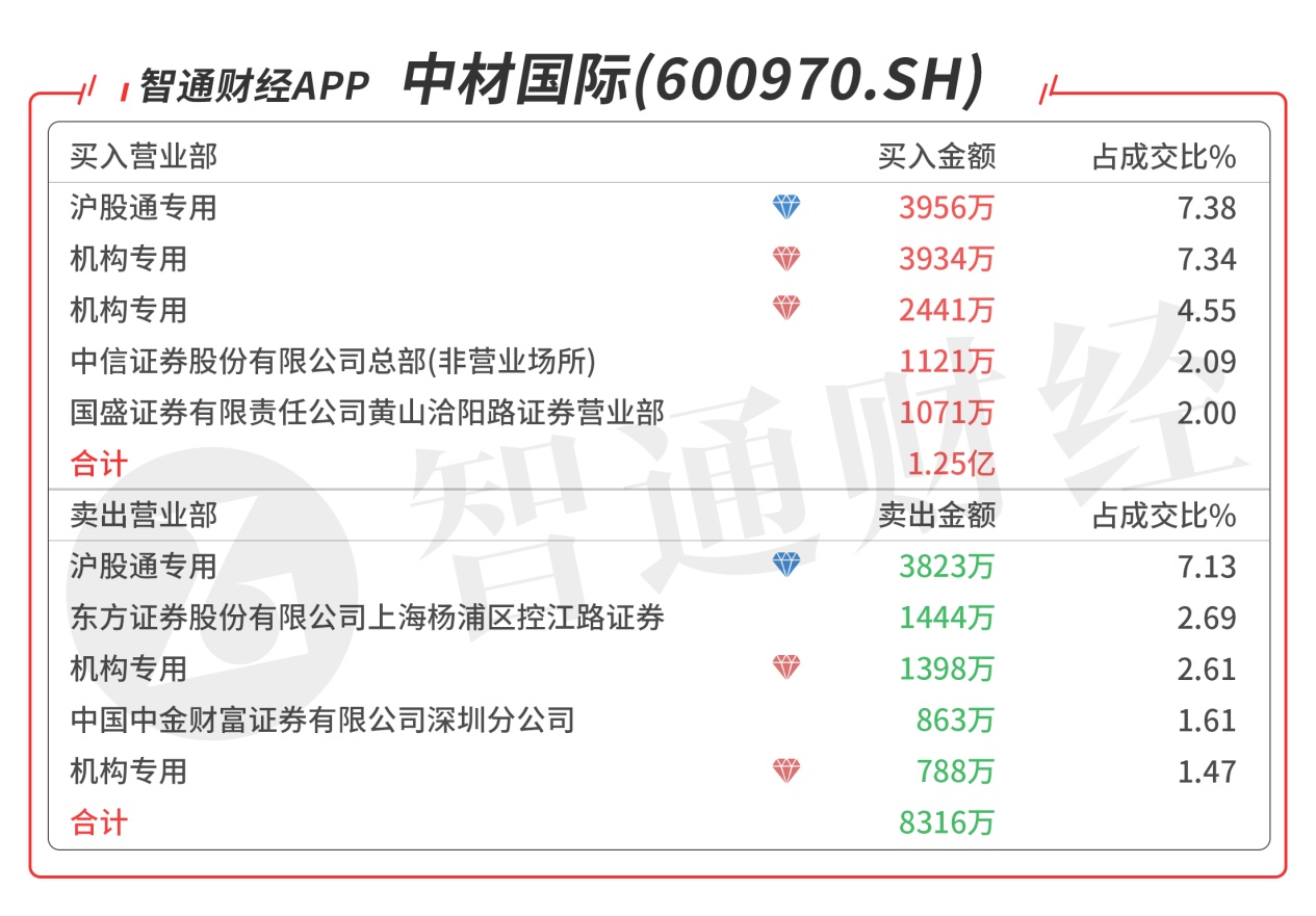 中材国际(600970.SH):受到众多机构青睐,今日共4个机构席位出现在龙虎榜单上,合计净买入4189万元,沪股通对倒净买入133万元,当日净买入4207万元,该股如突破前期高点,则有望打开上升空间。