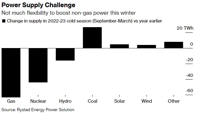虽然工业端已经减少了天然气消耗量,但发电厂对这种燃料的需求一直高于预期。今年夏天,热浪和干旱气候削弱了欧洲水力发电能力,而河水变暖和法国核能中断限制了原子能发电。