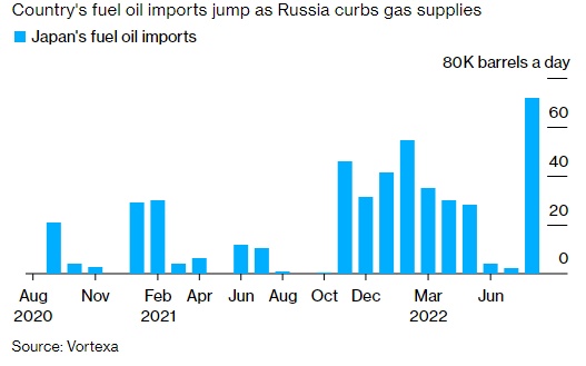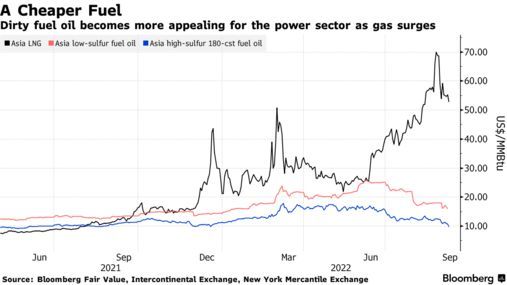 燃料油常用于为船舶提供动力,当天然气供应紧张时,它是公用事业公司的常年备用选择。因今年天然气短缺,燃料油的使用量急剧增加。尽管日本和韩国等国家制定了净零排放目标,但它们仍选择将电力供应安全置于减排之上。