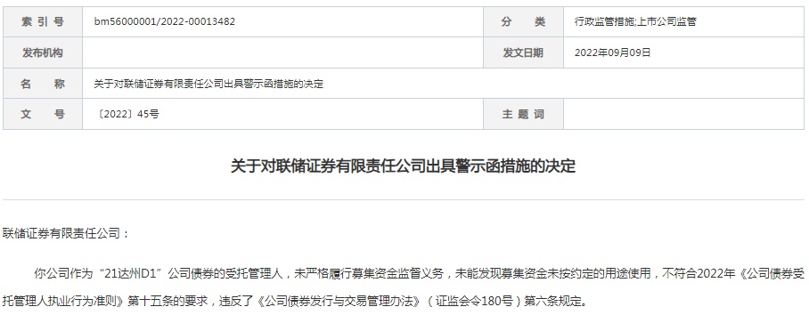 联储证券作为“21达州D1”公司债券的受托管理人,江海证券作为“20达州03”和“21达州01”公司债券的受托管理人,均因未严格履行募集资金监督义务,未能发现募集资金未按约定的用途使用,被四川证监局出具警示函。