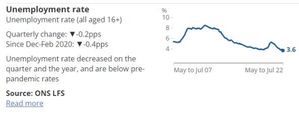 智通财经APP获悉,周二,据英国官方公布的月度数据显示,由于越来越多的人离开劳动力市场(包括长期病患者和学生),以国际劳工组织(ILO)标准计算,英国5月至7月的三个月失业率环比下降0.2个百分点至3.6%,为1974年5至7月以来的最低水平。接受调查的经济学家此前预计英国失业率将维持在3.8%。