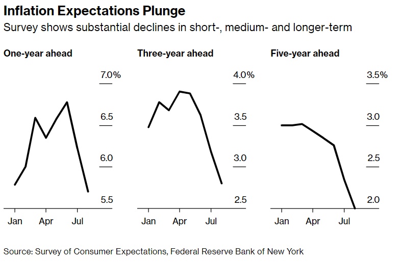 智通财经APP获悉,纽约联储最新调查数据显示,美国消费者对未来几年的通胀预期大幅下降,为正在努力抑制物价压力的政策制定者带来了又一好消息。纽约联储周一公布的月度消费者预期调查显示,8月份消费者对美国未来三年期通胀的预期降至2.8%,低于6月份的3.6%和3月份的3.2%。对未来一年通胀的预期从7月份的6.2%降至5.7%。最新调查还显示,消费者对未来五年期的通胀预期为2%,而不是之前的2.3%。