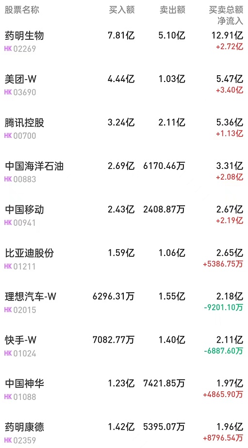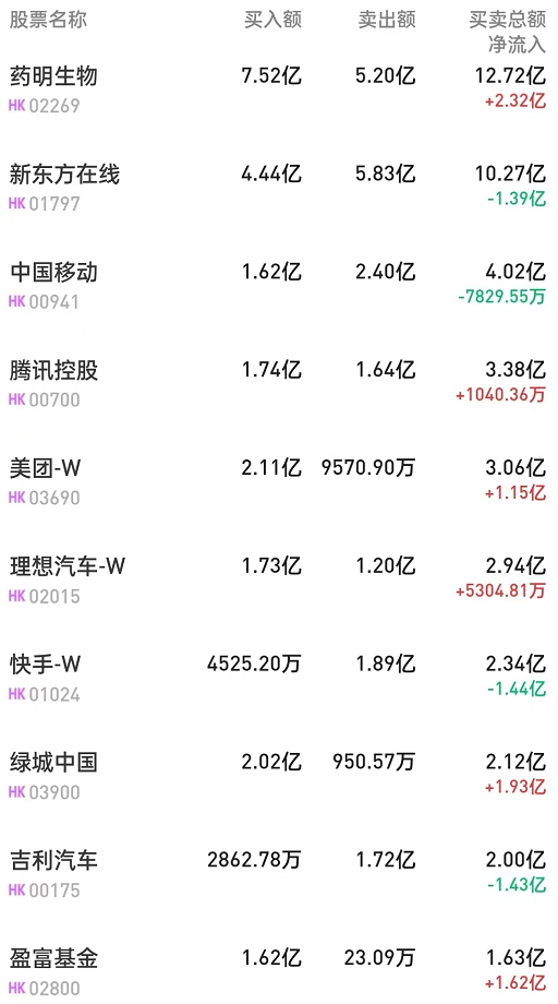 此外,绿城中国(03900)、盈富基金(02800)分别获净买入1.92亿、1.62亿港元。
