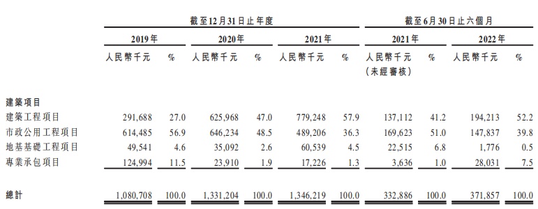另外,值得一提的是,2019-2022年上半年中深建业从超过200个建设工程项目及市政公用工程项目中确认总收益约为37.89亿元。其中,18个项目的合约金额超过5000万元,另有70个项目的合约金额超过1000万元。换言之,公司半数以上的项目合约金额不足千万。