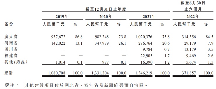 分地域来看,中深建业的收入主要来源于广东,报告期各期来源于该省的收入占比均超过七成。同时,河南亦可算作中深建业的重要根据地,但期内来源于该省的收入具有一定波动性,至今年上半年占比已收窄至7.9%。此外,公司尚有少数收入来源于四川、福建以及其他地区。