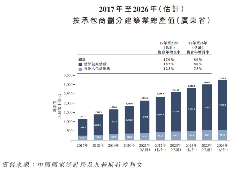 从经济体量来看,亦可以窥见基建的重要性。以中深建业深耕的广东省为例,2020年该省建筑业总产值变达到了18430亿元,而2021年预计将达到21346亿元,2017-2021年复合年增长率约为17%。另据预测,至2026年广东的建筑业总产值将达到32249亿元,2021-2026年对应复合年增长率约为8.6%。