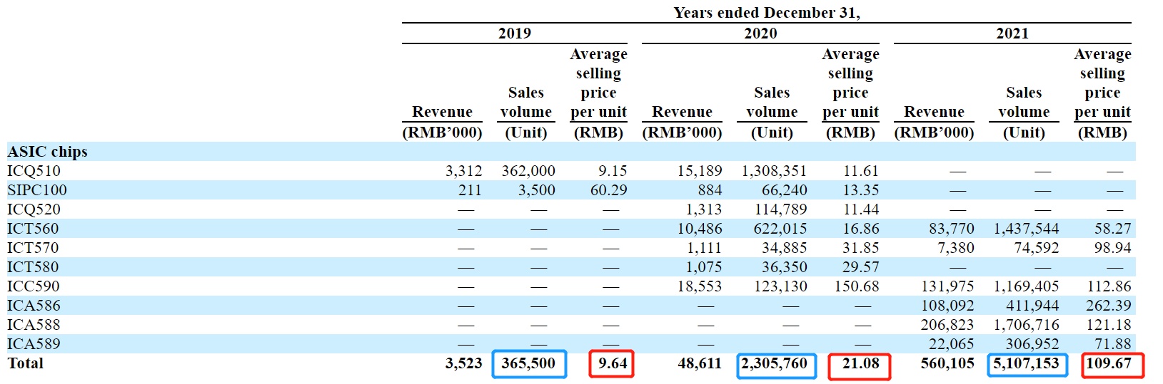 从过往的销售数据来看,聪链集团实现了所售芯片的“量价齐升”,而这得益于原有芯片的放量以及新量产高算力芯片价格的提升。据招股书显示,2019至2021年,其出售芯片的数量分别为36.55万、230.58万、510.72万;同期每单位芯片的平均单价分别为9.64元、21.08元、109.67元,价格的上涨对公司收入的增长显然更具弹性。