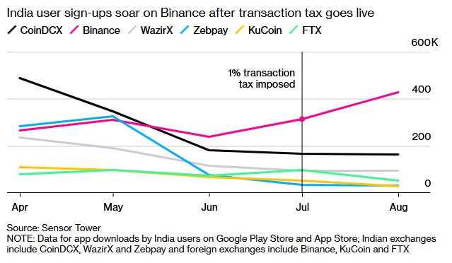 包括币安、FTX等许多外国加密货币交易所暂时还没收到税收的影响,这促使加密货币投资者转向它们。瑞士SEBA Bank AG子公司SEBA India的首席执行官Rohan Misra表示:“印度政府最近的税收法规定并没有明确说明1%的TDS税是否适用于涉及期货的加密衍生品交易,就像适用于加密货币现货交易一样,”币安则表示:“目前正在密切关注事态发展,并将在适当的时候发布进一步的公告。”