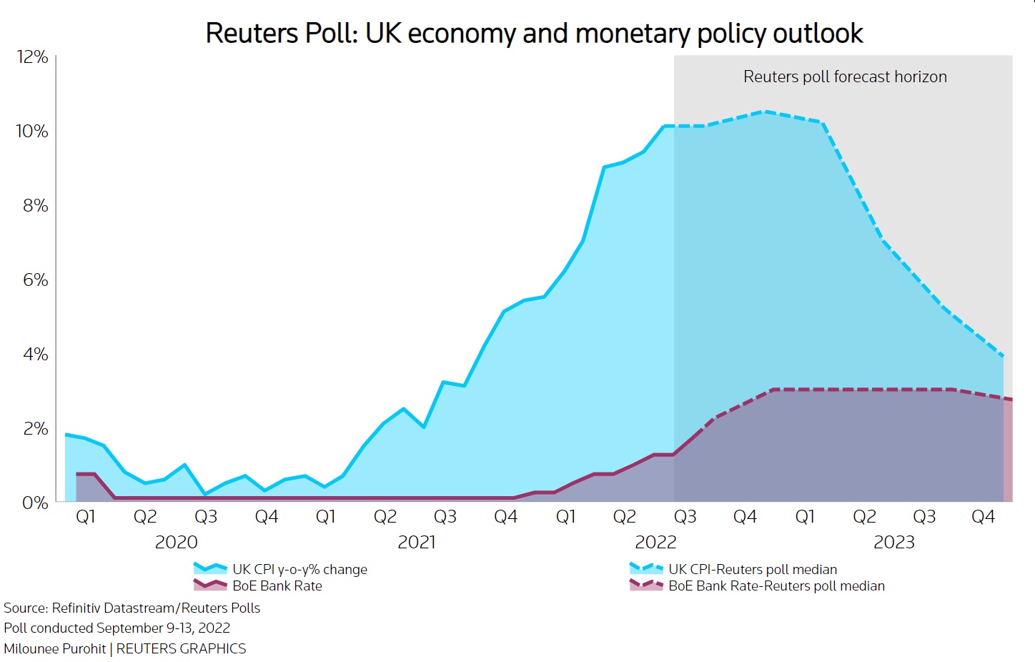 在路透社9月9日至13日进行的调查中,绝大多数经济学家(47人中有40人)认为,英国央行将在9月22日将基准利率上调至2.25%,即再度加息50个基点;其余7位经济学家则认为,英国央行下周将选择加息75个基点,因为该行正在努力控制通胀,而目前英国的通胀水平仍是其目标水平的约5倍。