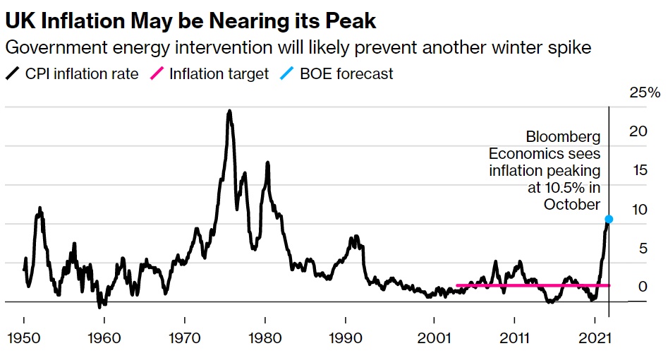 彭博经济预测英国通胀率将在10月份达到10.5%的峰值,远低于英国央行8月份在特拉斯预测的超过13%。包括英国央行在内的多数机构预计,假设天然气和电力成本不继续上涨,明年价格涨幅将迅速回落。
