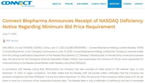 今年6月中旬,康乃德生物(CNTB.US)收到纳斯达克交易所的退市警告,原因在于公司连续30个交易日盘价低于每股1美元,已不符合纳斯达克上市规则。随后,康乃德生物表示,将密切监控其美股股票收盘价,以在合规期内重新遵守纳斯达克的规则。