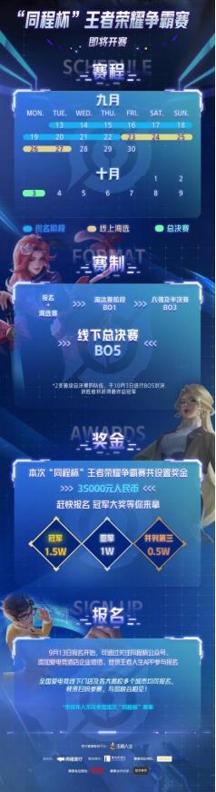 本次赛事将于9月23日至27日开启线上海选赛,赛事由腾讯王者人生赛事平台支持,用户可通过平台实现组队报名,参赛等环节。最终通过海选赛、淘汰赛等层层比拼将有2支队伍进入最终的总决赛,并获得差旅住宿全免的奖励。10月3日,“同程杯”王者荣耀争霸赛线下总决赛将在郑州360广场开启,决出赛事的总冠军。本次总决赛将设置数万元奖金。